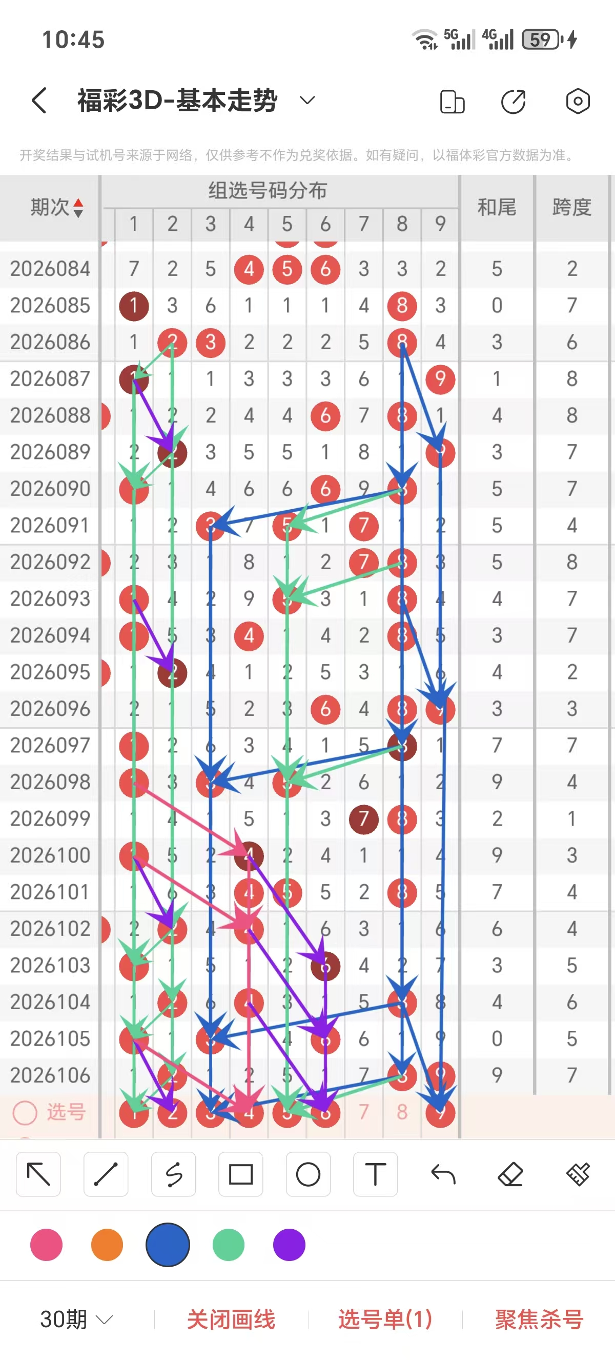 跨度通常情况下在五期之内重复一个跨度的概率很高,近五期重复了5的跨度,近五期跨度为4/5/6/5/7,近期12路的跨度较热,上期是1路的跨度,本期要侧重跨度以3/5/8跨为主的号码组合。可以从跨度方面选择相应的双胆码组合,双胆码的选取要根据近期和历史的走势进一步的分析选取。