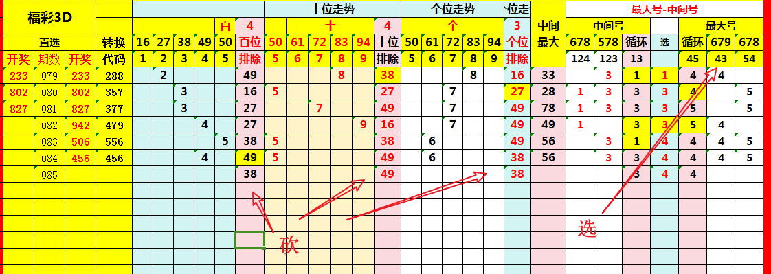 依据上述既定规则,将近期百、十、个位开出的号码,逐一对号入座,计入表格,条理清晰,有据可查;搭建研判表格如图: