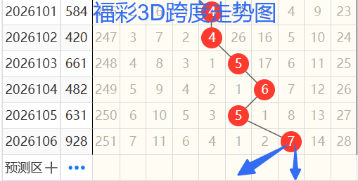 依次是45657跨度,按照路数转换关系来看,那么跨度我们暂定147258跨 ,本期个人比较看好5 7 4跨。