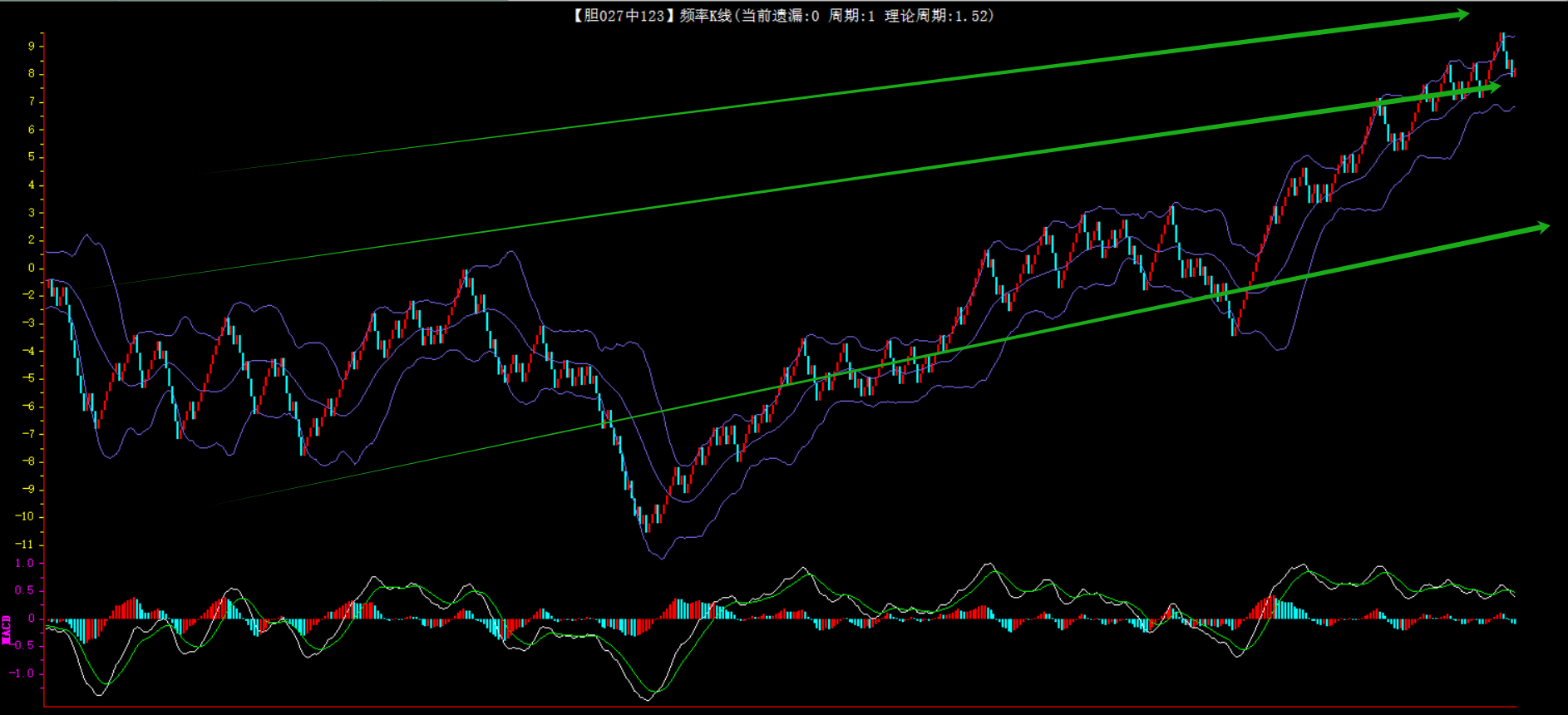 整体趋势上行,上边沿线趋势向上,下边沿趋势也是向上,节点震荡,当前开1期,本期关注。