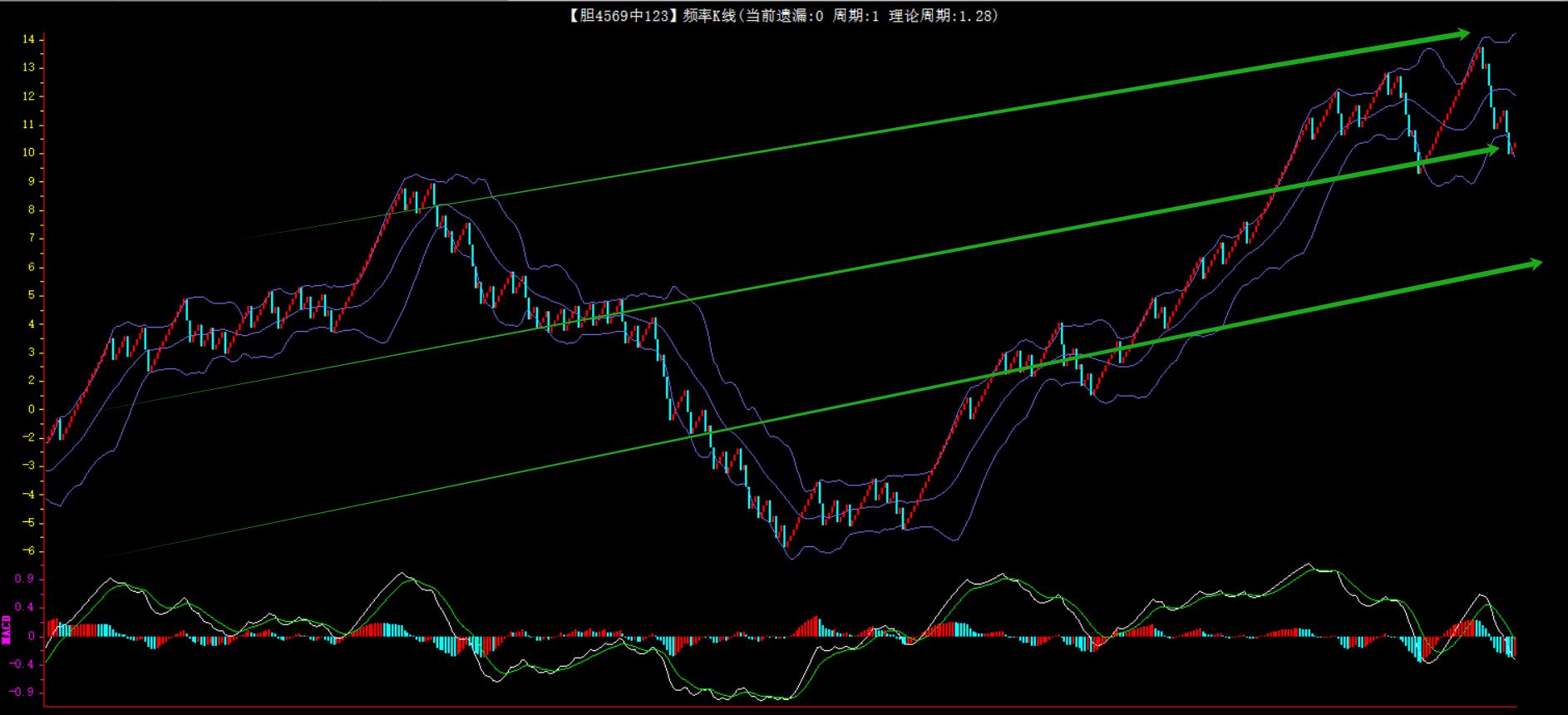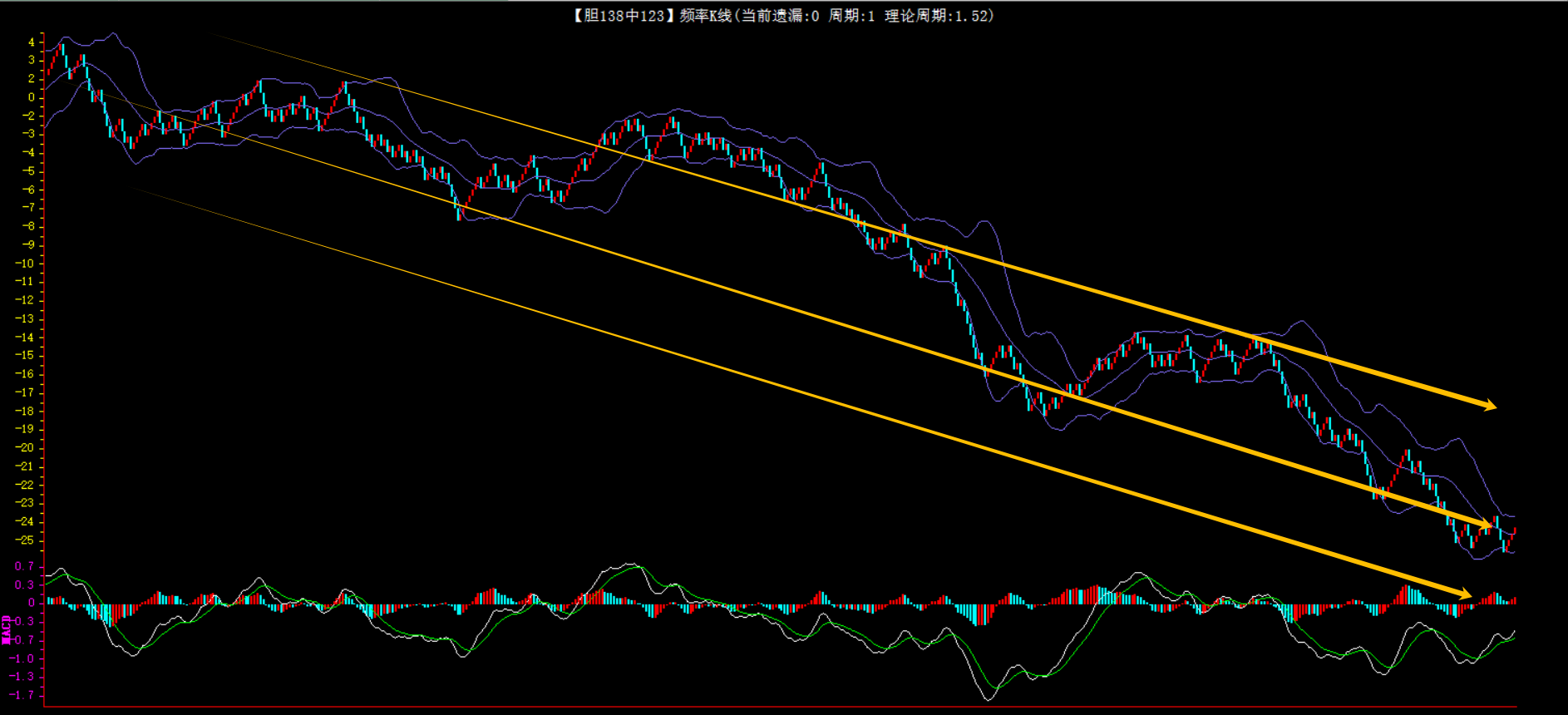 整体趋势下行,上边沿线趋势向下,下边沿趋势也是向下,节点震荡,当前连开4期,本期防守。