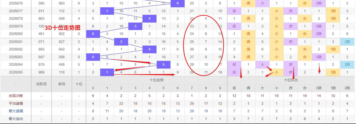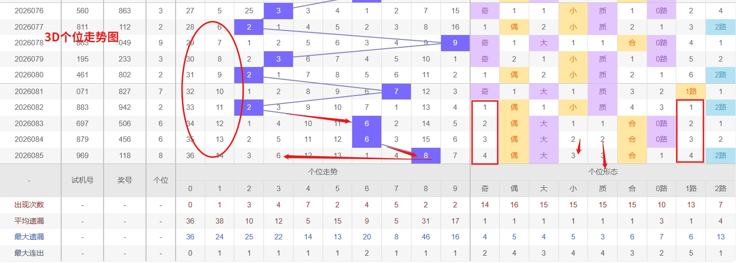 福彩3D个位分析:第2026085期个位开出号码8属于大偶数后端,从以上个位走势图中可以看出近100期的大小比约为48:52奇偶比约为55:45大小奇偶数据上有点差异有需求但不是太明显,不太好看这时就要借助连线走势和遗漏数据来帮助我们缩水号码。上期个位落号“8”大偶数2路号码球,号码开出了2振幅,连续多期的大振必被小振幅取代幅符合我们的预期,那么本期我们在个位考虑振幅走势走前依然要转变思路考虑大振幅,具体考虑(2-6)个振幅是我们主要的方向,那么在对个位落号情况进行系统的分析时我们可以明显的看到个位号码走势呈现大范围震荡,尤其是在号码的落位特点上表现的尤为突出,那么本期我们在个位分析时就要注意号码的风险,避免出现踏空。近期3D个位走势中,数字0和1双双处于冷号状态,两者遗漏值均已明显超出历史平均间隔,从冷号回补的普遍规律来看,长期未出的号码往往会在大家关注度下降时突然出现,尤其是当两个相邻小号同时走冷时,其中至少一个率先反弹的概率较高;数字0作为个位上的边缘号码,近期几乎绝迹,但其在整体出号分布中不可或缺,遗漏积累越久,回补动力越强,而数字1同样沉寂多期,与0形成双冷联动,接下来需重点防范二者中任一号码的突然开出。与此同时,数字4则表现强势,是个位当下最典型的热号,近期出球节奏连贯,连坐或隔期再现的频率明显高于其他号码,热号走热后往往会延续一段活跃态势,因此对4也不能掉以轻心, 因此福彩3D第2026086期个位看好01349。本文由钱是生命动力所著,请勿转载
