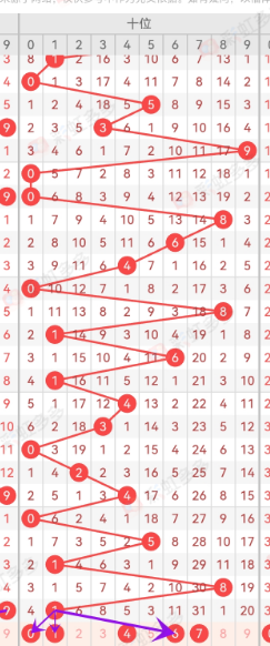 上期十位开出1号球,小号(01234),1在十位的前后关系出现8号球,本期看好大号球(56789),小号看好1号球防04号球,大号看好6号球防7号球。接下来分析十位奇偶走位,根据前面的走位数据分析,本期看好偶数,防奇数,综上分析,十位关注145607的走位!