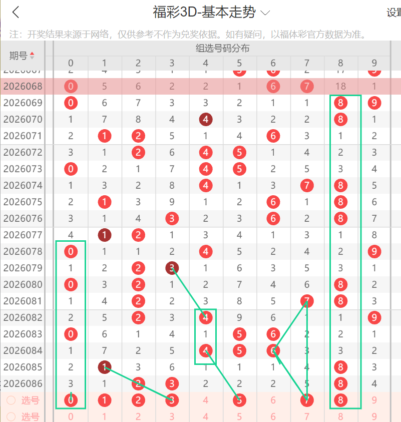 上期开出382,组6,012路比1:0:2,和值13,奇偶比1:2,重号8,小数。本期继续关注小数,单数。和值振幅1到3.