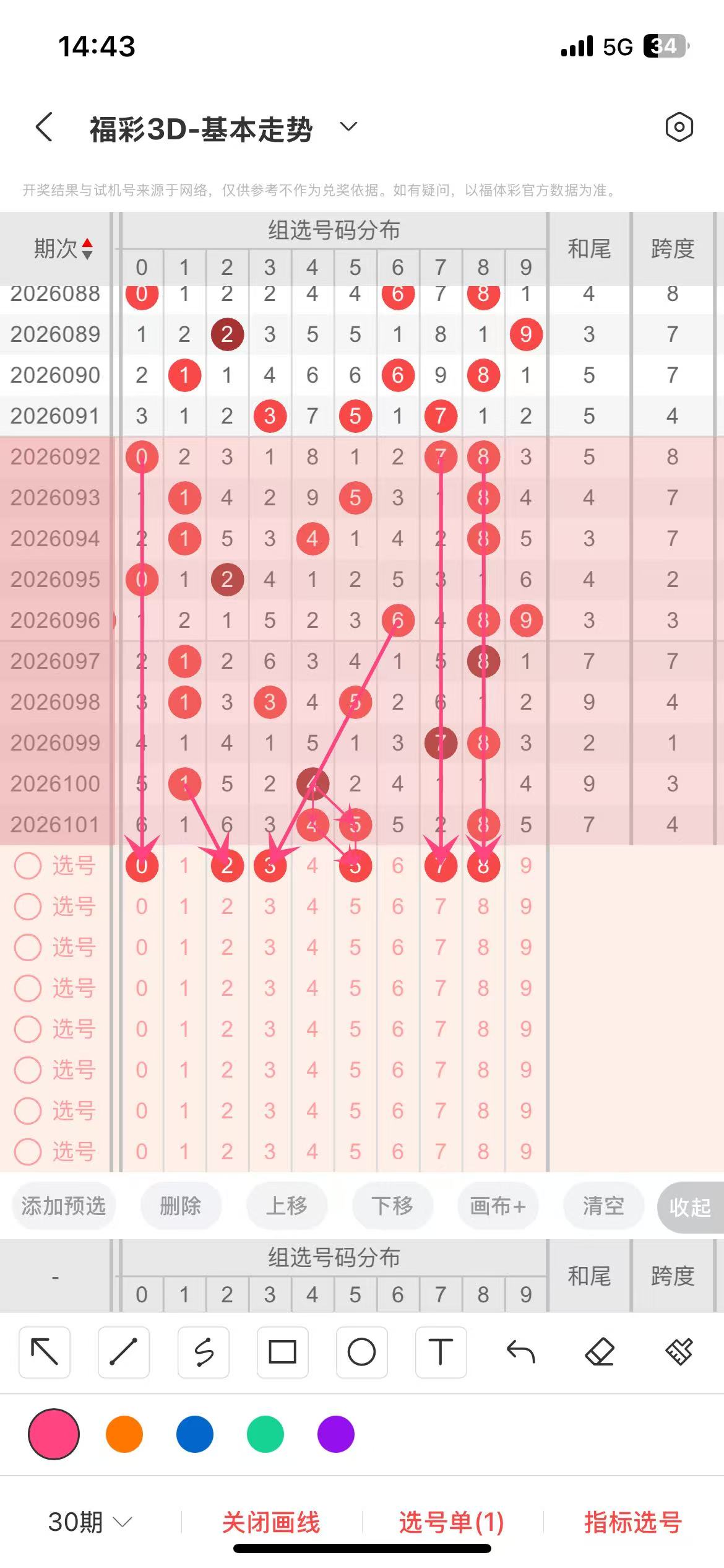 冷号:0、2、6、9已经连续5期遗漏,是最冷的四个号码,下一期回补概率很高。另外3、4、5、7只出现1-2次,也有补缺机会。
