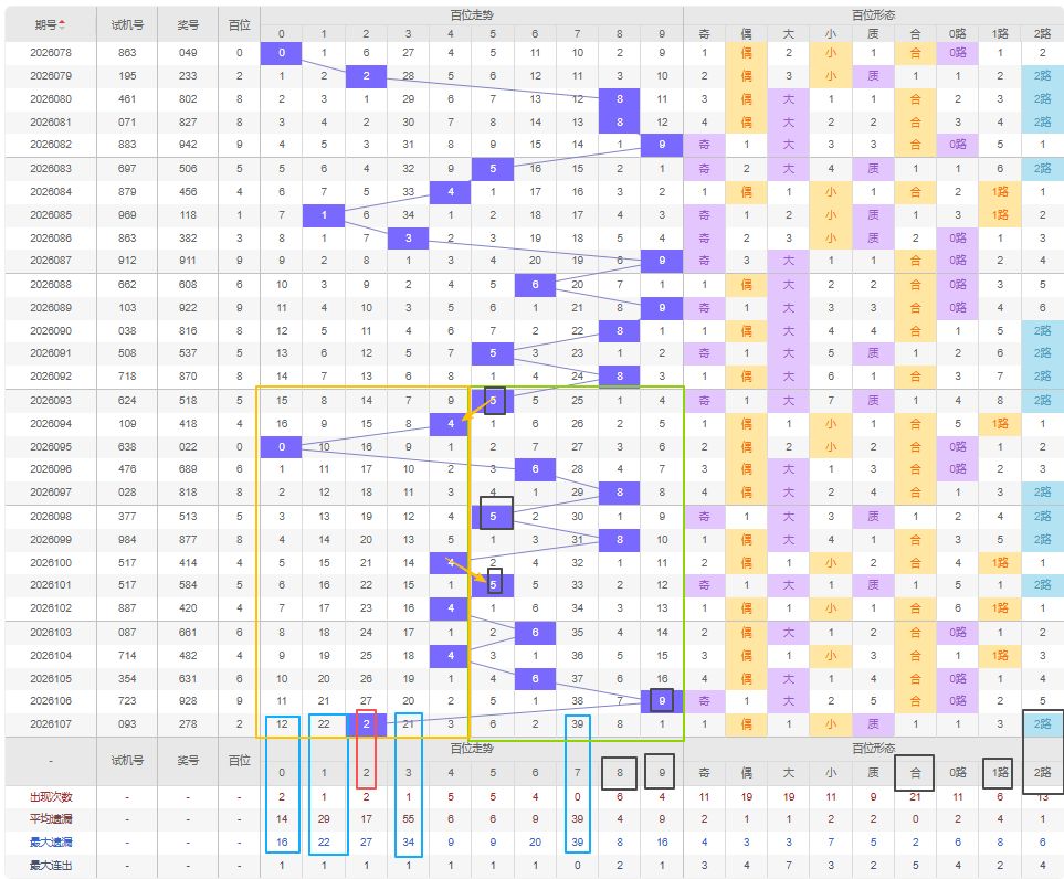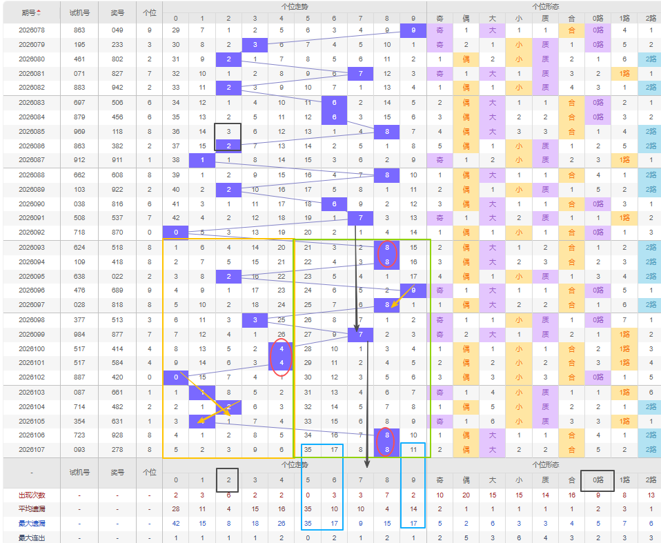 福彩3D第2026108期百位首先分析本期百位奇偶数的形态,可以看到近15期开出偶数号11期,奇数号4期,开出奇数号的概率比开出偶数号的概率相差较大,近五期开出了4期偶数号,根据以上所述本期看好开出奇数号。推荐考虑遗漏期数较大的奇数号,比如本期冷号可以考虑1号、3号、7号都已经遗漏十期以上,而且7号是百位遗漏期数最大的号,开出几率较大建议考虑防冷号开出。另外近十五期都没有出现一次重号,可以防2号重号开出。杀号建议定在偶数号,但0号都遗漏十期以上达到了最大遗漏期数,可以考虑防冷号开出。从012路数分析,本期开1路或2路,可以考虑5号和8号。