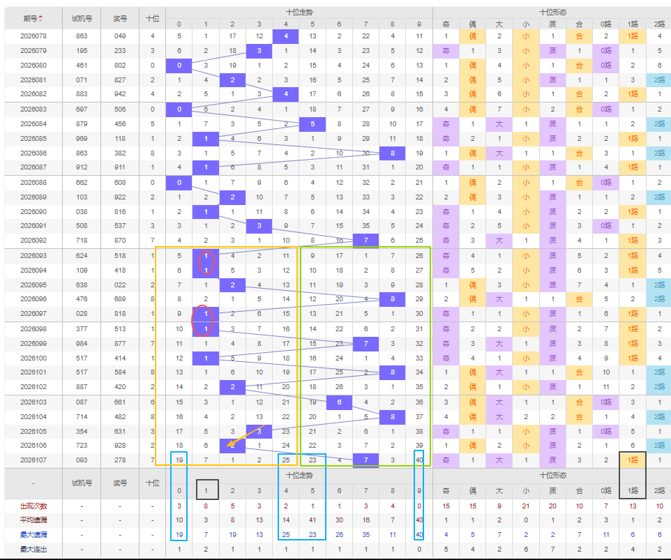 福彩3D第2026108期十位建议分析奇数偶数概率,如图所示近十五期开出奇数号8期,偶数号7期,开出奇数号的概率比开出偶数号的概率是要大一些 。近十五期开出偶数和奇数时连出几率大,大多为连出几期又奇偶间隔着开出,上一期开出的奇数7号。那么本期开出奇数号的概率较大,本期看好十位将继续开出偶数号,建议选择遗漏期数较大的号开出,4号遗漏期数达到十期以上而且都达到了最大遗漏期数,那么可以防冷号开出。比如近十五期只有1号开出过重号,那么本期暂不考虑7号继续开出形成重号。012路号可以考虑1路1号。建议杀号定在所有偶数号,但是0号遗漏十期以上达到了自身的最大遗漏期数,还是十位遗漏期数最大的可以防冷号开出。