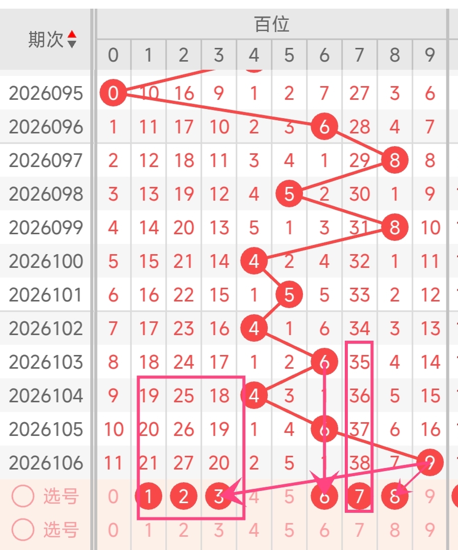 本期百位推荐号码:1,2,3,6,7,8。
