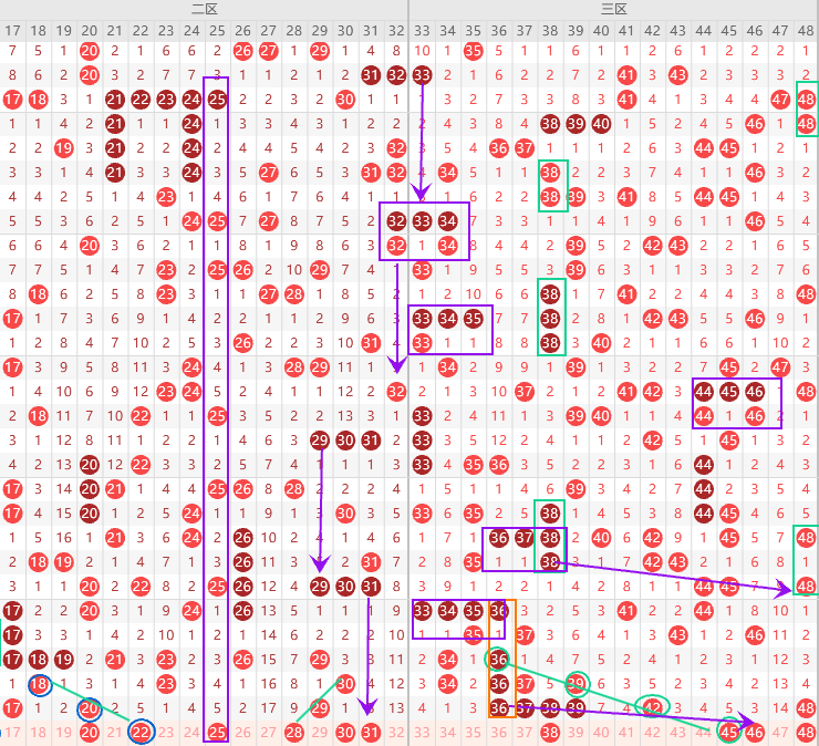 上期三区走热本期可以跟一期,应该最少出4码,边号35 40 41 43 47出一码,一区上期出15三直落,如果15断应该是回三区,之前讲过,比较稳定的趋势,那么本期35 45概率较大,优先35,看上图勾画38三直落断回48,本期36如果不出4重号,优先46,本期36 46可以选一,形态上35  38 45是斜连号,8尾不单出,38是大明号,上面全是重号出,喜欢就用,逆向思维就是48,看上图勾画三连号,四连号下面一直出重号,出5次了,正常本期36 37 38 39应该有出一码,有点冒险,建议优先重号48,概关注五码35 38 44 46 48防33