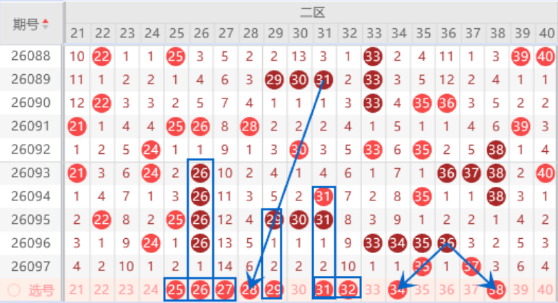 该区间25 26 27号数字是属于重号26号数字的回补号码,本期我们注意一下出号情况,其中的25 26号数字可以重点关注一下。本期的28号数字是属于对应斜连号码,出号机会是有可以关注一下。本期的三连号29 30 31号数字已经断号2期了,本期我们注意一下出一个号码的情况,其中的29 31号数字我们可以重点关注一下出号情况。本期的34 38号数字我们注意一下出号情况,这里可以防守一下同出的情况,或者防守一下33 38号数字同出的情况。