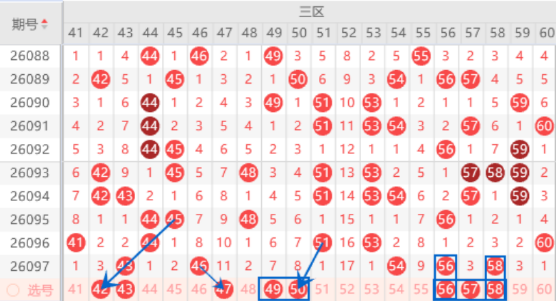 该区间的42号数字我们注意一下出号情况,本期可以防守一下42 43号数字同出的情况。本期的47号数字我们也是要防守一下出号情况,本期可以防守一下46 47号数字同出的情况。本期的49 50号数字我们防守一下出一个号码的情况,其中的49号数字可以重点关注一下出号情况。上期开出了54 56 58号数字,本期我们注意一下出重号的情况,其中的56 58号数字可以重点关注一下出号情况,夹号我们关注一下57号数字的出号情况就行了。