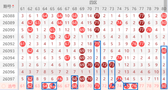 该区间的62号数字我们注意一下出重号的情况,本期可以防守一下62 65号数字同出的情况。本期的60 64号数字都是属于空三中心号码,本期我们注意一下出一个号码的情况,其中的64号数字可以重点关注一下出号情况。上期开出了66 68 69 70号数字,本期我们注意一下出重号的情况,其中的66 68号数字可以重点关注一下出重号的情况。本期的71 72 73号数字我们也是要注意出号码的情况,其中的71 73号数字可以重点关注一下。