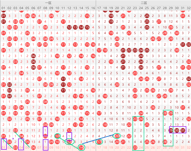 边号 1 3 4 6 8 11 13出1-3码,重号2 5 9 10 12出一码,3 7 6 8 14是斜连号,上图已勾画,遗漏值隔一期号1 4 8三出一,隔2期号出多期,本期只有3,重号缩小范围2 9 12三出一,本期一区应该接着走热出4码以上,关注五码2 4 7 9 11防14
