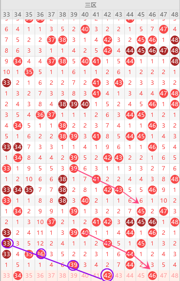 边号38 40 43 45出1码,重号防39 44,形态上42是斜连号,上图已勾画,46跟上面45一样错位回补,4尾热,44不出优先34 ,本期3区接着走冷,不建议多选,关注五码34 38 40 42 46防41