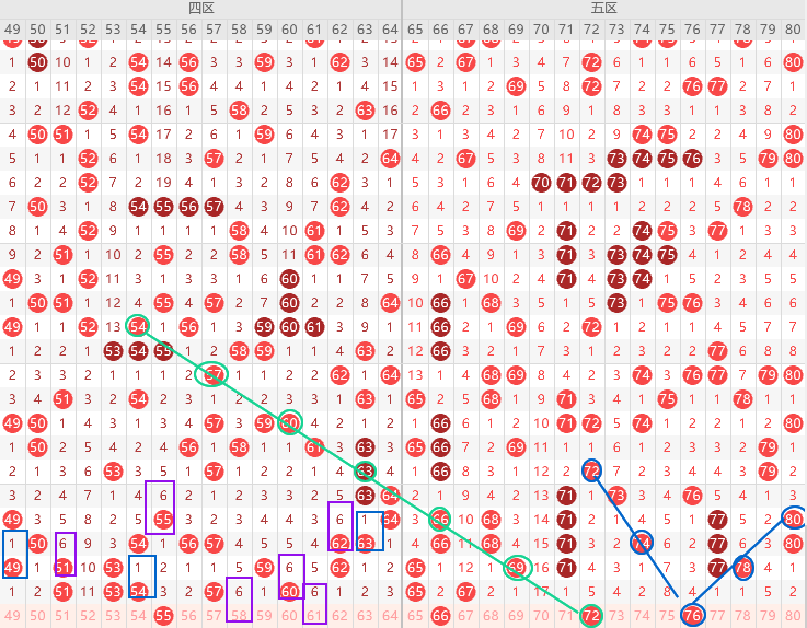 边号50 52 55 56 58 59 61出2码,重号防51 53 60出一码,遗漏值隔1期号出多期,本期49 59 62三出一,如果60不走重59优先,看上图勾画遗漏值隔6期号58 61二出一,58是上面梅花最后一位回补,58优先,四区应该是走冷,遗漏值值55 64二出一,关注五码49 55 58 59 60防64双胆55 58