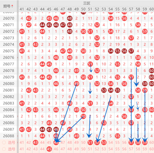 而三区的打底号是42.46.48.50.51.52.57.58.59中参考3-4码开出机会,