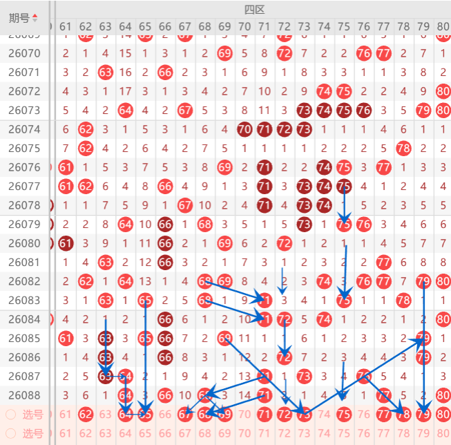 四区间关注的打底号是61.64.65.67.69.68.71.73.75.78中参考3-4码开出机会