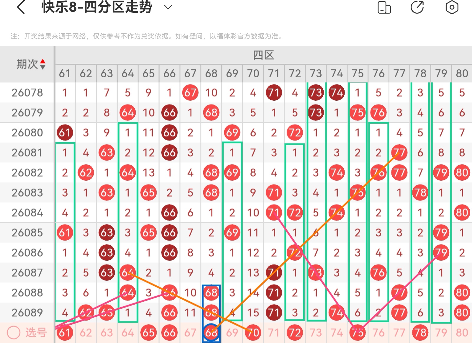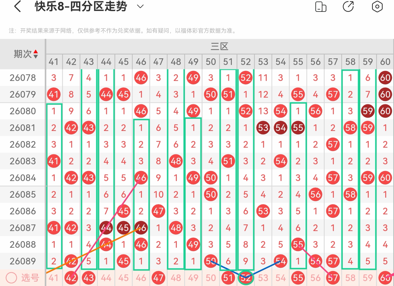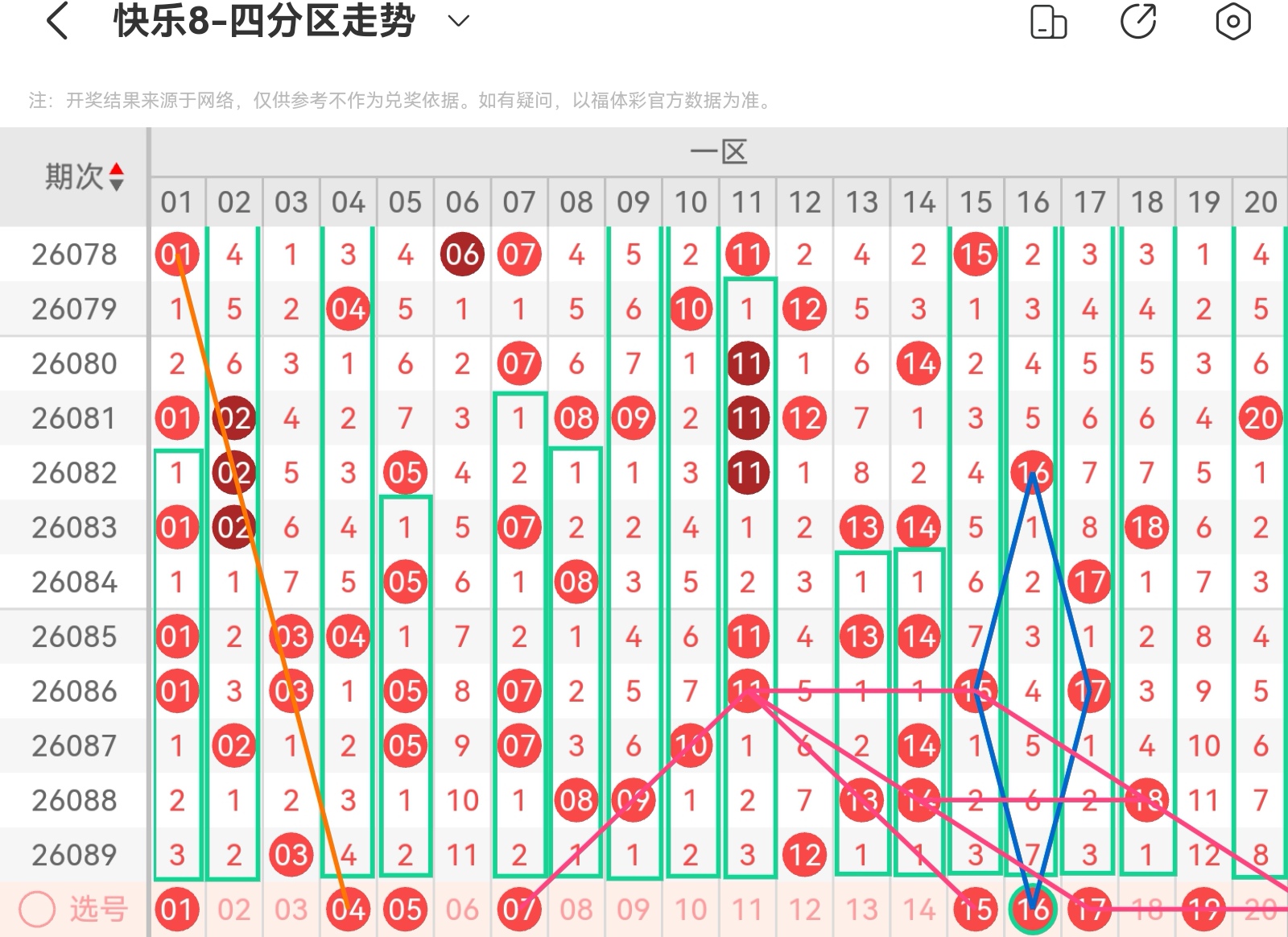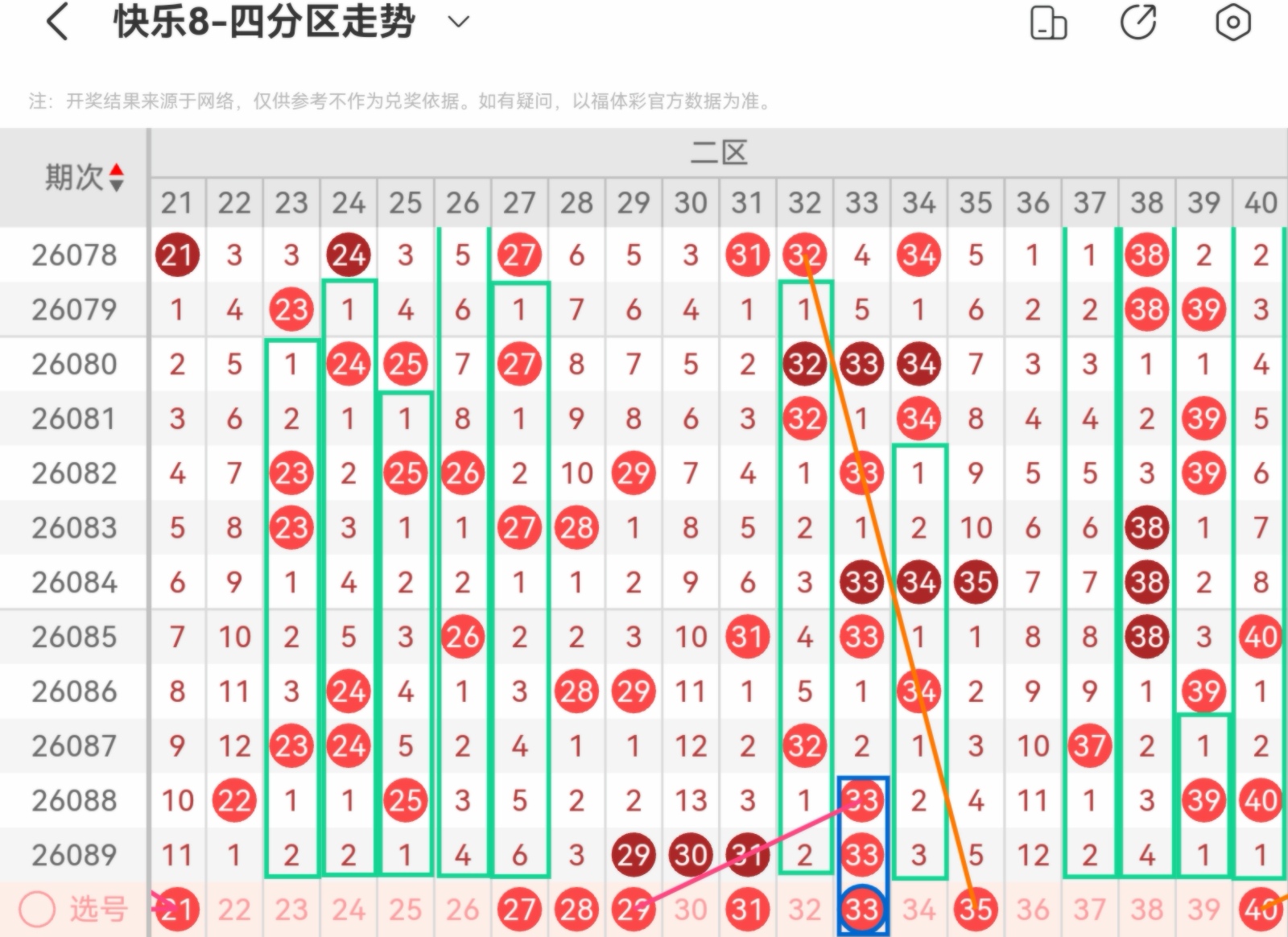 大家好,我是甜丝丝的坏事,主要以快乐八的形态走势、空位走势、遗漏走势以及斜连走势相结合的方法,用公认的四分区走势来进行预测分析,希望能让你有所收获。