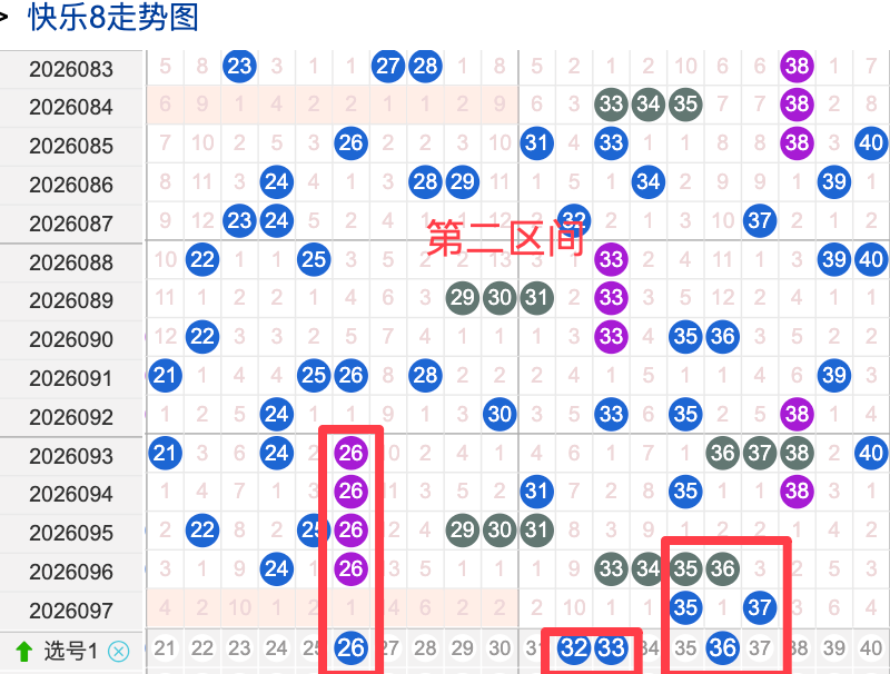上期二区开出2个奖号(35.37)上期回顾二区开出2个奖号二区间在上期落位同比前期的话呈现了一个递减落位趋势,先来看本期号码26整体活跃度较热,在近 30 期里有一定的间歇性出现,不是每期都开,近期整体走势还是很稳定。号码33近期热度较热,间隔性整体比较热,说明其在当前阶段活跃度较热注意防守。号码32近期活跃度较温冷有一定的间歇性近期整体走势相对还不是很稳定有特别明显的冷热趋势变化,号码36近30期内活跃度较温冷,没有明显的连续出现形态走势,整体表现比较温冷。