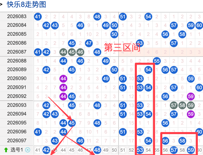 三区间开出了5个奖号(43.46.54.56.58)上期回顾三区开出5个奖号上期的三区间的奖号数量呈现一个不变的形态,4头回补2个,5头回补3个,本期先来看号码42期出现频率相对来说还是很稳定。偶尔有时间隔期数也是很稳定,但是在近期的开奖中较热注意防守,号码48在近 30 期内出现次数相对是稳定的号码,近期的活跃度也是较稳定。号码53有一定的间歇性,通常间隔5-3期会出现一次,没有明显的连续出现态势,走势相对还是很稳定,在整个第三区间的表现较热本期还是可以防守的。号码59走势相对近期较热,近期没有连续间隔落号的情况,活跃度近期处于热状态注意防守。
