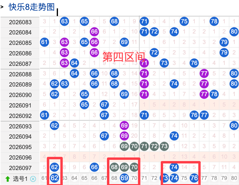 上期四区间开出了6个奖号(62.66.68.69.70.74)上期的四区开6个奖号呈现了一个递增趋势,开出的奖号6头回补4码,7头回补2个,先来看号码62在近 30 期内属于还是稳定的号码,近期出现频率相对温热,偶尔会间隔多期后出现一次,这个号码要注意防守,号码69具有一定的间歇性近期活跃度是很稳定比如有时会间隔3到8期就再次出现,有时会间隔多期,近期整体出现频率比较热,近期还是要关注的.号码74活跃度近期比较稳定,有一定的间歇性,整体走势有一定的波动性.
