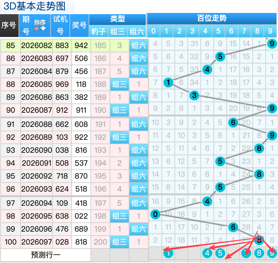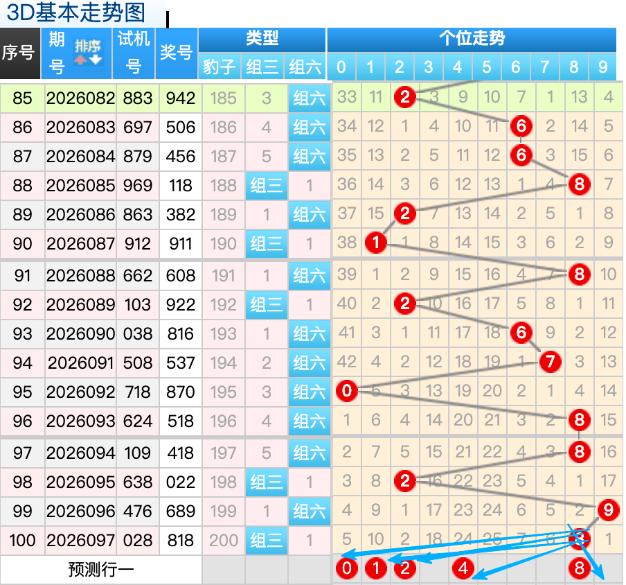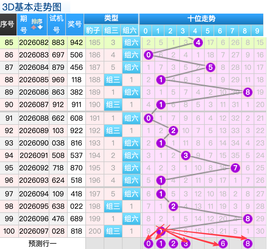 上期3D十位开出的奖号1号,上期在十位上1号球这个号码是一个7跨码号回补码的落位点,本期来看2号在十位上要注意这个号码是有机会继续走出热号分边落位的趋势这里的号码回补形态注意防守就好,再来6号球这个点位注意防守走出5跨冷号码的落位趋势。0号球这个小周期号的分边落位回补要注意参考。8号球要注意走出折返的落位回补。