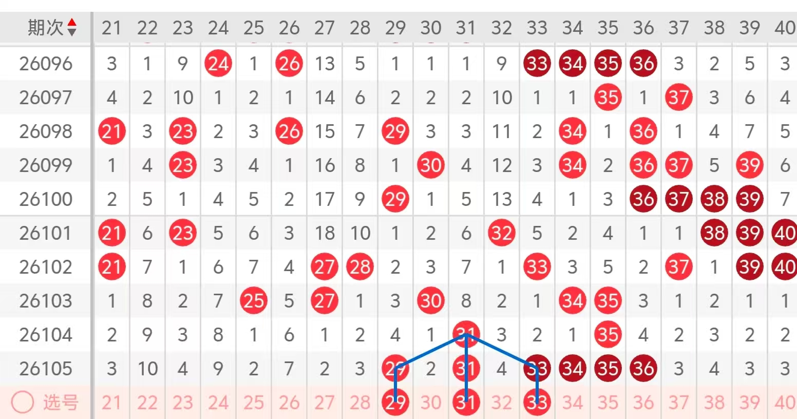 第二区间的走势分析:第二区间上期开出了六个号码球,主要的落号点位在二区间的后半区,走出了四奇两偶的形态走势,上期二区间的前半区落下了一个号码球,后半区落下了五个号码球,整个二区间处于走热的趋势,根据二区间的走势规律,今天的二区间我们主看29 31 33这三个号码球重码的落位,至少有两码落下,31走出了三重码,29 33都是冷码的落位,这三个号球建议大家打个三胆拖,或者打个三码复二比较稳妥,参考为主!