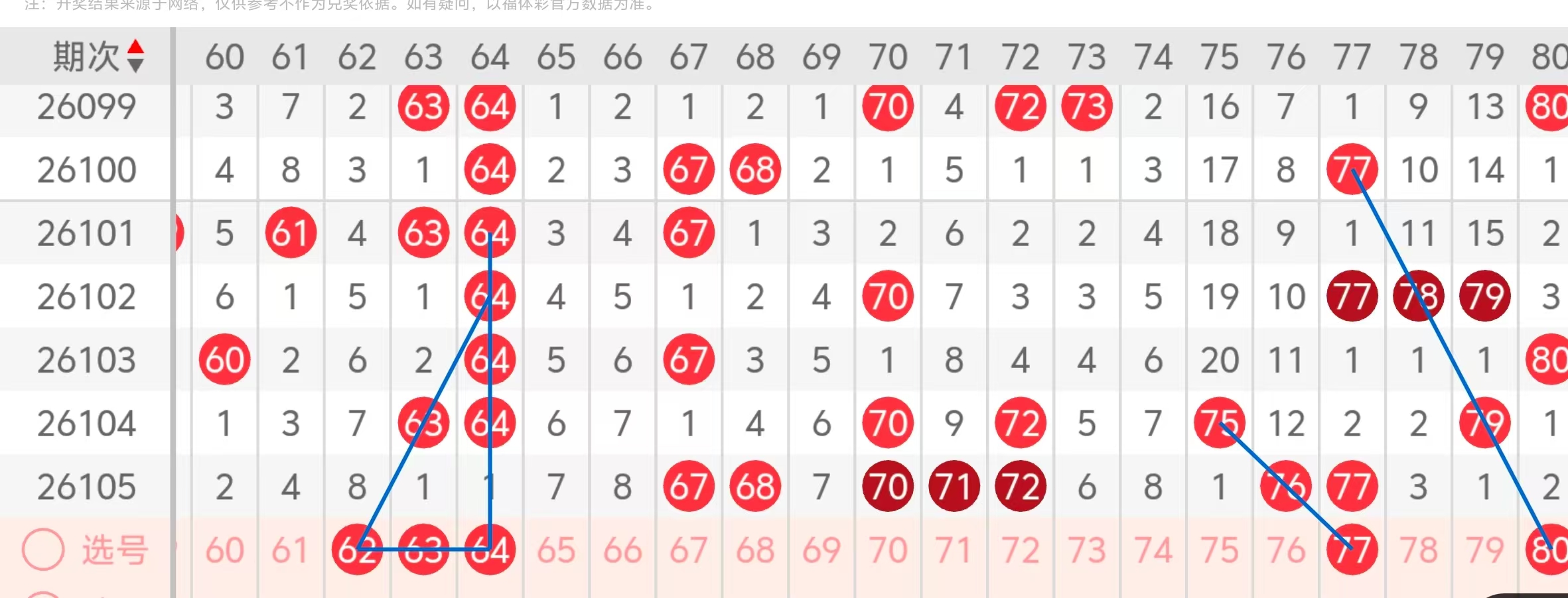 第四区间的走势分析:第四区间上期开出了七个号码球,主要的落号点位在四区间的前后半区,走出了三奇四偶的形态走势,上期四区间的前半区落下了三个号码球,后半区落下了四个号码球,整个四区间处于走热的趋势,根据四区间的走势规律,今天的四区间我们主看前半区62 63 64这三个号码球的落位,走出了斜连码的走势形态,再看77 80的组合,77走出了斜连码的走势也是冷码的回补,80也走出了斜连码的走势,这五个号球建议大家打个选五单式,或者打个五码复四,五码复三比较稳妥,参考为主!