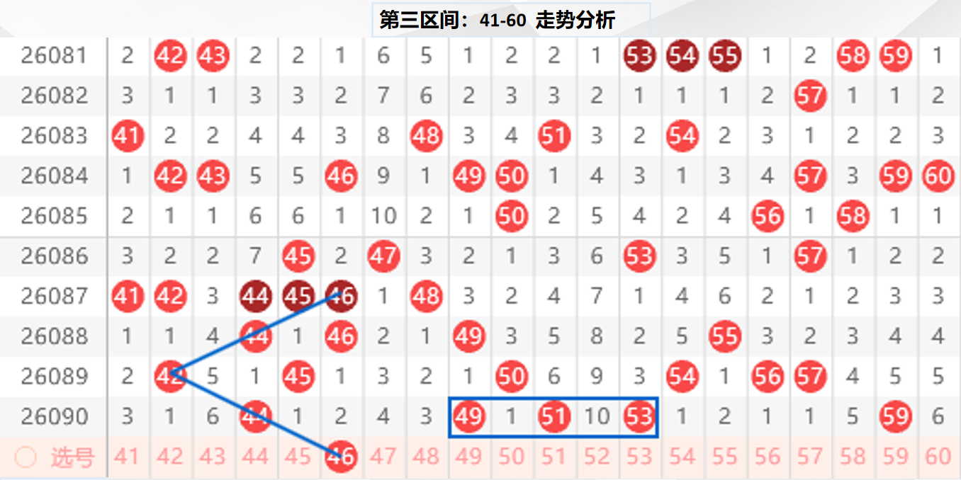 三区分析:【41-60】(走势图标注号码非小黄车大底,请谨慎参考,具体思路将在直播间分享讨论)