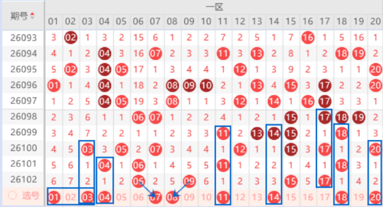 该区间的01号数字我们注意一下出号情况,本期可以防守一下01 03号数字同出的情况。本期的03 04 05号数字是属于交叉对称回补号码,是有机会出一个号码的,我们重点关注一下03 04号数字的出号情况。本期的11号数字是属于空一对称号码,本期我们防守一下出号情况。本期的13 14号数字也是有机会出一个号码的,其中的14号数字可以重点关注一下出号情况。本期的18号数字是属于对应号码,出号机会是有的,本期我们可以防守一下18 20号数字同出的情况。