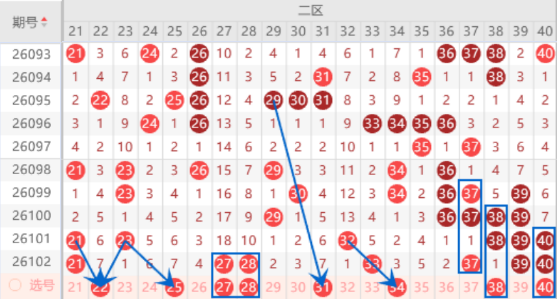 该区间的22号数字出号机会是有的,本期我们防守一下22 25号数字同出的情况。上期开出了27 28号数字的连号,本期我们注意一下出一个重号的情况。本期的29 31号数字是属于交叉对称号码,本期是有机会出一个号码,其中的31号数字我们可以重点关注一下出号情况。本期的34号数字是属于三斜连号码,我们防守一下出号情况。本期的38号数字是属于对应号码,出号机会是有的,我们可以防守防守一下38 40号数字同出的情况。
