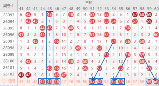 该区间的45号数字是属于151走势,本期是有机会出号的,本期我们可以防守一下44 45号数字同出的情况。本期的46号数字我们注意一下走三重的情况。本期的51号数字是属于四斜连号码,本期是有机会出号的,本期我们可以防守一下51 52号数字同出的情况。本期的54号数字是属于三斜连号码,出号机会是有的,可以防守一下54 55号数字同出的情况。本期的59号数字我们注意一下出号情况,本期可以防守一下59 60号数字同出的情况。