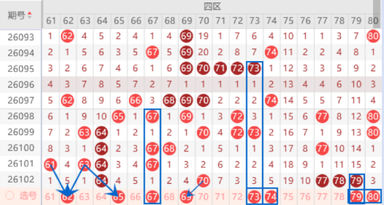 该区间的62号数字我们注意一下出号情况,本期可以防守一下62 65号数字同出的情况。本期的67号数字都是属于空一对称号码,出号机会是有的,我么呢可以关注一下。本期的73号数字是属于空三对称号码,本期我们防守一下出号情况,注意一下73 74号数字同出的情况。上期开出了77 78 79号数字的三连号,本期我们注意一下出重号的情况,其中的78 79号数字我们可以重点关注一下出重号的情况。本期的80号数字我们注意一下出号情况,本期可以防守一下79 80号数字同出的情况。