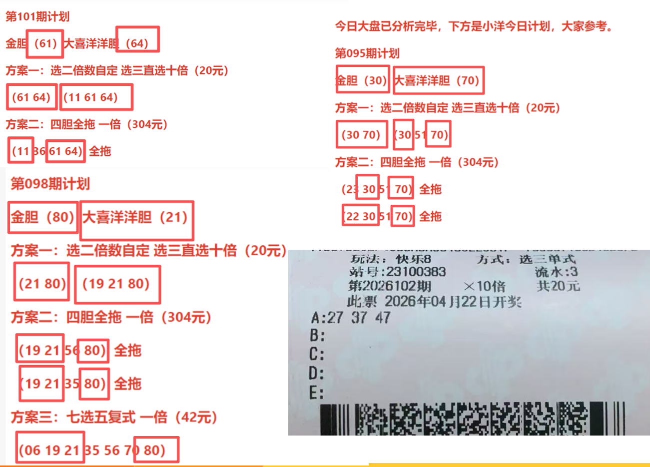 以上就是小洋今日推荐的快乐8本期推荐号码。每天(下午四点半)和(晚九点四十)准时直播,欢迎来直播间讨论交流,更有大佬胆码,精选号。