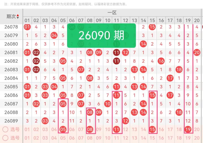 上期第一区间开奖2个号码,本期可能会增加开出。05作为区间内温码,前期走势平缓,近期号码波动中逐步回归活跃,能有效弥补前段出号空白;08是偶数核心码,尾数8在走势中活跃度持续走高,和前期开奖号码68形成奇偶互补;11为奇数号码,同尾号码在往期开奖中联动性较强,前期同尾热号开出后,该号码顺势跟进的概率较高;15处于一区中段位置,承上启下衔接前后段号码,近十期开出频率稳定,属于区间内稳健型号码;19靠近一区尾部,与二区号码形成衔接。
