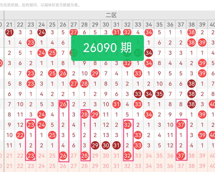 上期第二区间开奖4个号码,本期可能会增加开出。23为区间奇数号码,前期开奖中奇数梯队表现连贯,该号码与上期开出号码形成奇数延续,间隔期数适中,符合区间奇数出号节奏;26依托尾数6的跨区联动性,往期同尾数号码开出后,同时偶数属性平衡了区间奇偶比例,让号码分布更均衡;28属于温冷过渡号码,遗漏周期处于合理范围,没有过度偏冷,在区间热度平稳的情况下,迎来回补的契机较大;32紧邻上期开奖号码,邻号走势是近期二区核心出号形态;37处于二区尾部,衔接三区号码,优化了区间整体分布,避免尾部出现号码空缺。