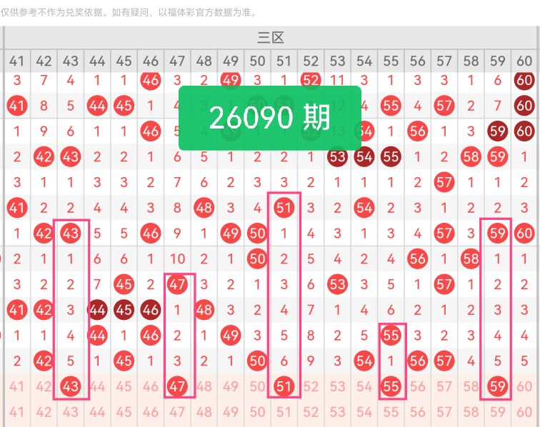 第三区间号码推荐:【43 47 51 55 59】