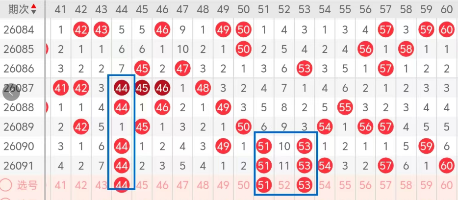 第三区间的走势分析:第三区间上期开出了六个号码球,主要的落号点位在三区间的后半区,走出了三奇三偶的形态走势,上期三区间的前半区落下了一个号码球,后半区落下了五个号码球,整个三区间处于走热的趋势,根据三区间的走势规律,今天的三区间我们主看前半区44走出三重码的走势,再看后半区51 53也走出三重码的走势,这一区间重码为主,其它号码球落下的机会就很小!这三个号球建议大家打个三胆全拖,或者打个三码复二比较稳妥,参考为主!