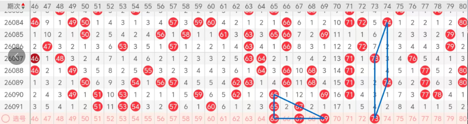第四区间的走势分析:第四区间上期开出了两个号码球,主要的落号点位在四区间的前半区,走出了两奇的形态走势,上期四区间的前半区落下了两个号码球,后半区没有落下号码球,整个四区间处于走冷的趋势,根据四区间的走势规律,今天的四区间我们主看前半区65 67 69组合的落位,走出了三角形的走势形态,再看后半区73的回补,走出了菱形的走势形态!这四个号球建议大家打个四胆拖,或者打个四码复三比较稳妥,参考为主!
