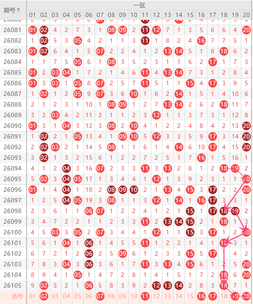 第一区间的走势分析:第一区间上期开出了6个号码球,属于前半区2个,后半区4个码。走出了1奇5偶的形态走势,根据一区间的走势规律,今天的一区间我们主看18码,根据18的走势规律,这二个号球重点关注19、20的组合。