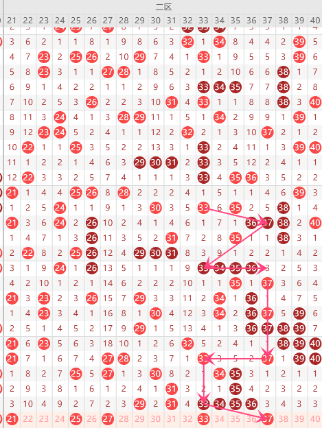 第二区间的走势分析:第二区间上期开出了6个号码球,前半区1个,后半区5个码,走出了4奇2偶的形态走势,根据二区间的走势规律,今天的二区间我们主看后半区33的码,根据33的落球规律,重点关注27、33组合
