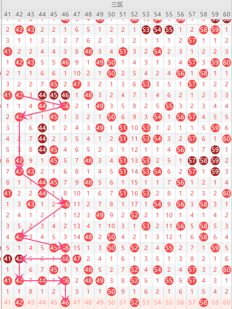 第三区间的走势分析:第三区间上期开出了1个号码球,属于前半区1个,后半区0个码。走出了0奇1偶的形态走势,根据三区间的走势规律,今天的三区间我们主看前半区位置42组合的落位,根据42的落球规律,重点关注42、52组合这个号码球的落位。