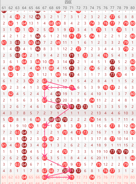 第四区间的走势分析:第四区间上期开出了7个号码球,属于前半区3个,后半区4个码。走出了3奇4偶的形态走势,根据四区间的走势规律,今天的四区间我们主看前半区67这个号码球的落位,根据67的落球规律。重点关注67、71组合