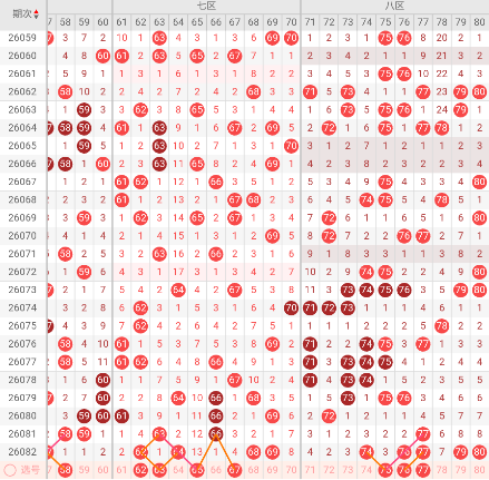 七区开出:62,64,68,69 奇偶比: 1:3 和值:263 跨度:7,上期开出4个号码,偶数号码占优势。虽然上期热度较高,但该区近期整体走势呈现出波浪形特征,即热一期冷一期。历史数据显示,本区在开出4码及以上后,下一期通常会降至2-3码。