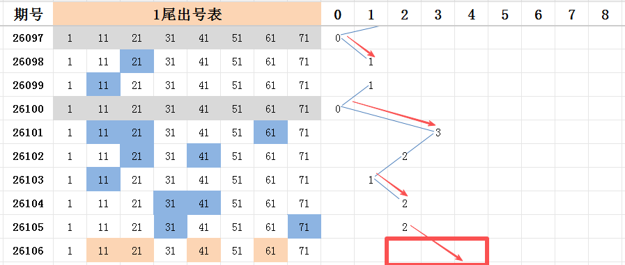 一尾上期开出两码走势,看好上期开出号码31的两个邻码:号码21和号码41,看好能够开出其中一码或者两码全开。前半部分看好号码11和号码21的连号走势。号码61其实也是有规律的号码走势21-41-61,可以看好开出。