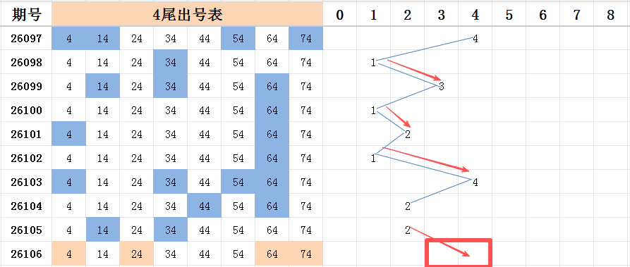 四尾上期开出两码走势,本尾主要考虑遗漏值,遗漏1期的号码看好号码64的开出,遗漏2期的号码看好号码02的开出,冷码看好号码24和号码74的开出。