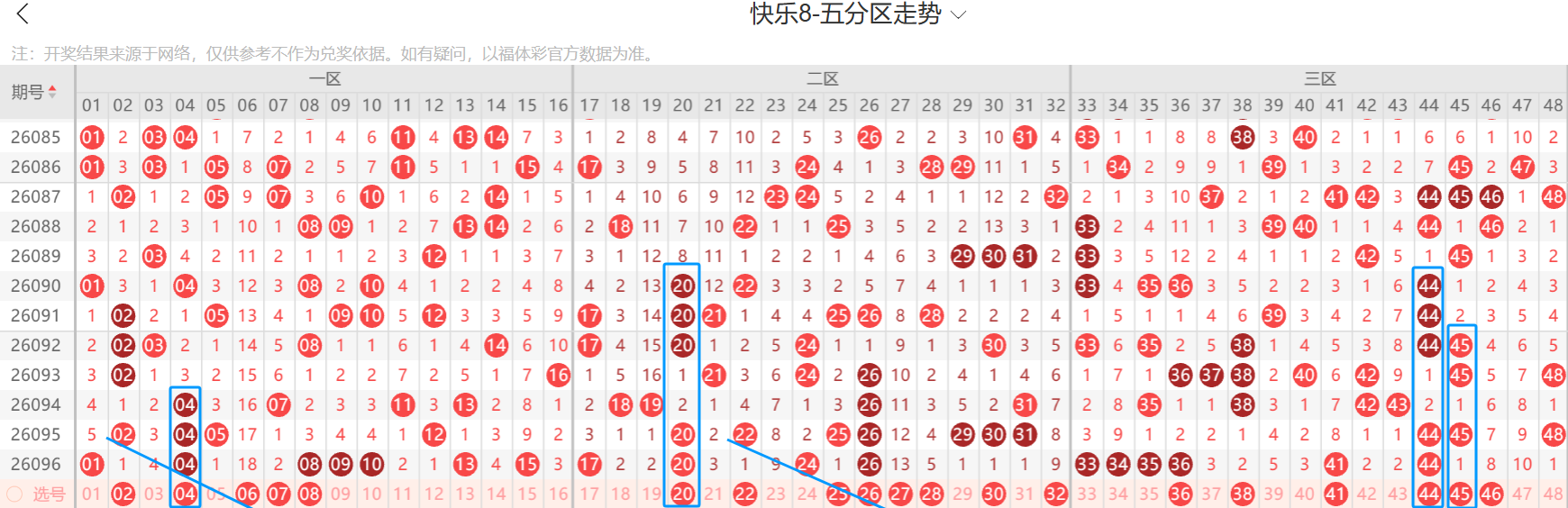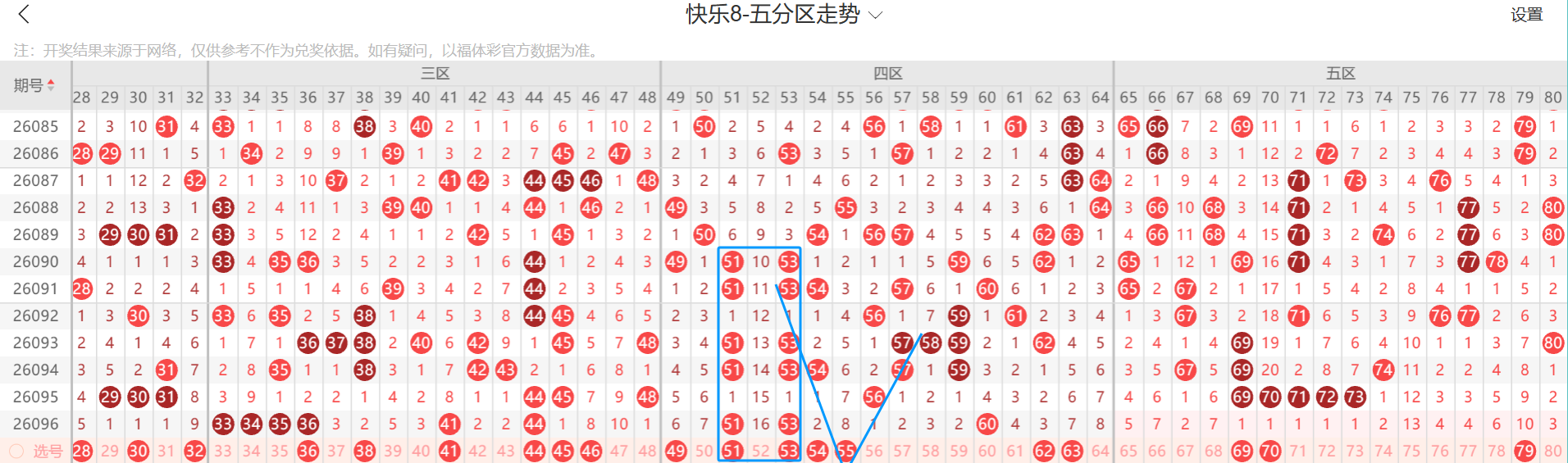 四区的这个51.53大家感觉还会给么,太好看了,我感觉危险,本期四区能出五个左右,重点关注55吧,其次关注49,我认为53不一定出,可以看看63,包括62,感觉62.63是可以出连号的,结论是四区重点关注49.54.55.62.63三胆49.54.55,双胆54.55,主胆54.五区都不想选了,太冷了,关注69.79出一,其次看看70.