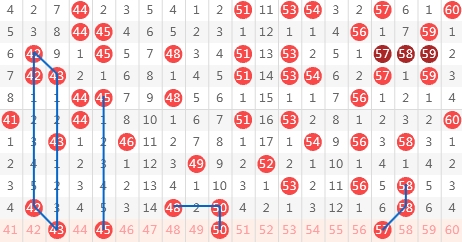 这个区间昨天开出了(42.48.50.58)4个号码球的落位,区间号码走出温态4码落位,那么通过对二区间落位号码进行逆向思维逻辑分析,区间前端给出了42.48.50冷热吗的回补,后端58重码的下落,那么通过分析来看三区间近期会继续走出温态的可能性最大,所以我们考虑热号的回补冷号接着走重,因此我们要注意区间号码的转换,预测本区间出号在3-5码