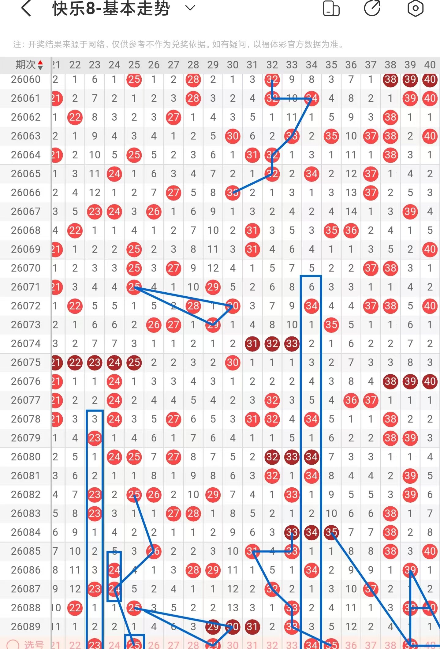二区间稳定落号,一共开出四个号码球,本期考虑增加号码球的数量,注意隔期对称回补的23号码球,阶梯落位重码走势注意25号码球,同时也是百期相似形态号码球,注意近期25、30号码球顺期下落,下期回补29号码球,注意期数和值加减法的34号码球,注意近期30、32、33、34号码球的走势与31、32、33、35号码球的走势相似,本期注意35号码球,注意斜连走势回补的39号码球,注意直角三角形走势的39、40号码球,因此二区间关注25-29-34-35-39,注意本区间的选二复式25-34-35。