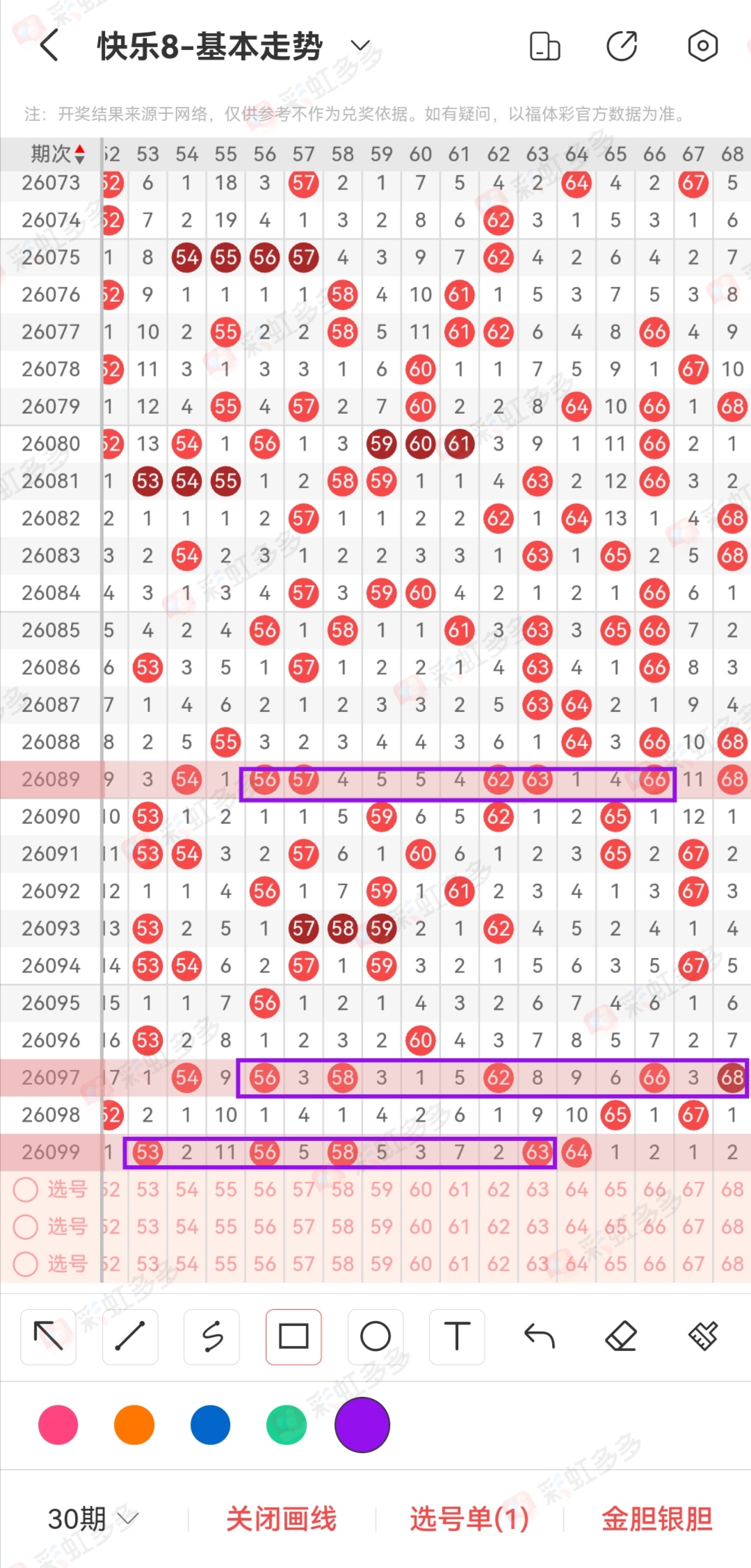 上面提到的56 57我们着重讲一下56。56抓住过两次,两次的数据逻辑方向都是一样的,遗漏递减以及当期存在同尾。比方说昨天的56出现,同尾存在53 63。按照之前的点位来看,可以直接避坑走重,这里我想说的点是能不能考虑65顺位或者说56走重继续存在同尾。当然需要注意,这里即使56走重,也不应该考虑53 63走重。不然这里的变化点就存在太多。如果大家有看好这里的5头6头同尾2码,那么可以试试56定胆打选三。这里只是过渡一下,实际上来说不太好的。